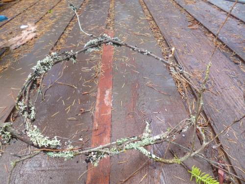 Normally, I use smooth Red Osier Dogwood or some kind of willow for the base, but I spotted these lovely lichen covered twigs and decided to live on the edge for once.